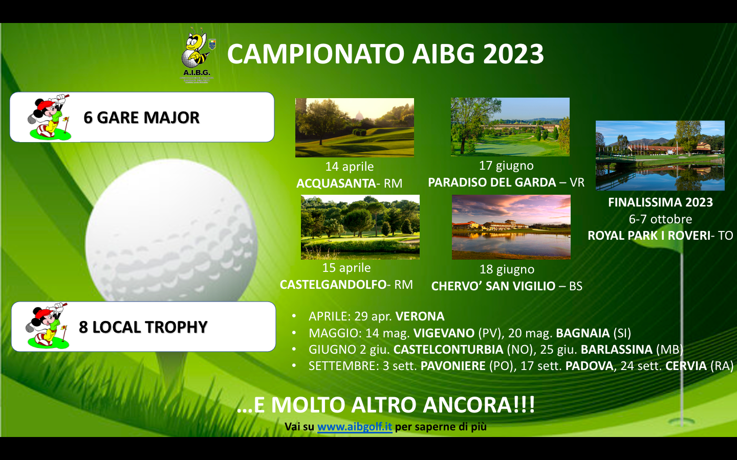 - Gare Major AIBG, le 6 tappe che costituiscono la spina dorsale del nostro Campionato. Partenza in grande stile venerdì 14 aprile e sabato 15 aprile, rispettivamente presso i blasonatissimi Circoli di Acquasanta e Castelgandolfo, sabato 17 giugno e domenica 18 giugno sarà la volta dell’abbinata Paradiso del Garda e Chervò ed infine venerdì 6 ottobre e sabato 7 rotta verso il Royal Park i Roveri dove giocheremo su entrambi i percorsi. A Torino per rendere ancora più intrigante la finalissima ed il Challenge, la gara si disputerà su 36 buche: l’obiettivo è portare sul podio i giocatori più performanti ma anche i più tenaci.